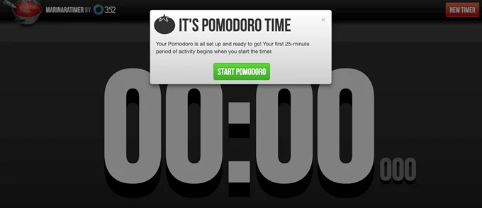 Bộ hẹn giờ Marinara là phiên bản đơn giản nhất của Bộ hẹn giờ Pomodoro có thể tưởng tượng được. Nó cho phép bạn đặt hẹn giờ cho khách hàng, nhưng trang web không có gì khác hơn ngoài một màn hình hiển thị số lượng lớn, với nút tạm dừng và khởi động lại bên dưới.