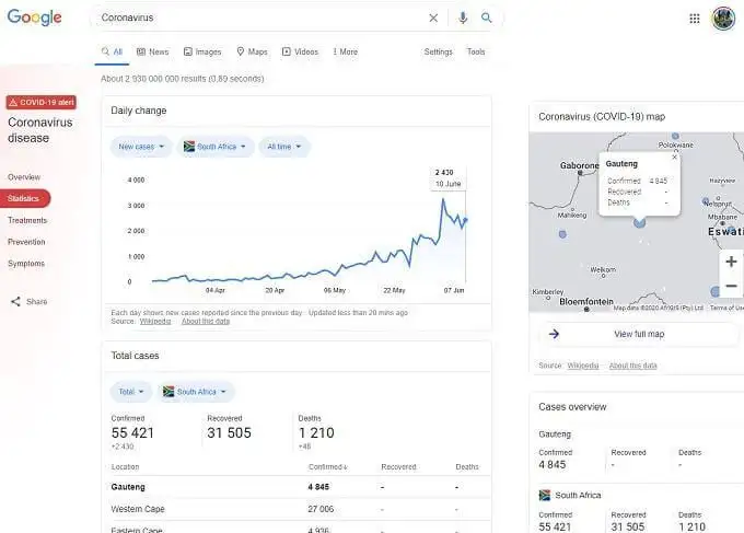 Nếu bạn tìm kiếm “coronavirus”, bạn sẽ đi thẳng đến trang tổng quan của chính Google. Nó tập hợp tất cả thông tin liên quan mà Google có thể tìm thấy vào một nơi.