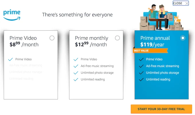 Trước hết, cứ sau 12 tháng, bạn có thể bắt đầu dùng thử miễn phí 30 ngày của Amazon. Bằng cách đó, bạn có thể tự mình thấy nếu bạn thấy những lợi ích mà Prime mang lại có xứng đáng với cái giá mà bạn sẽ phải trả sau này hay không.