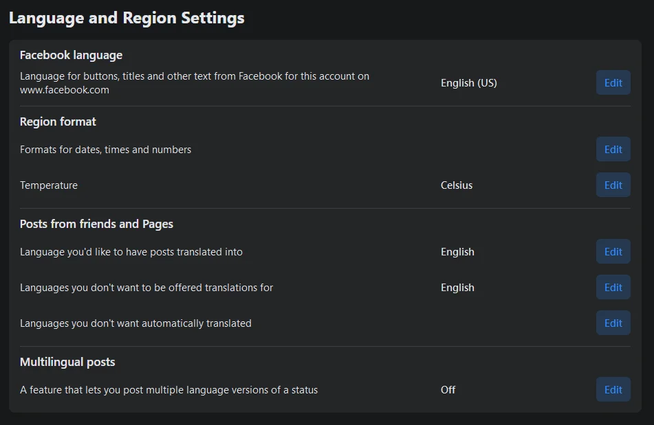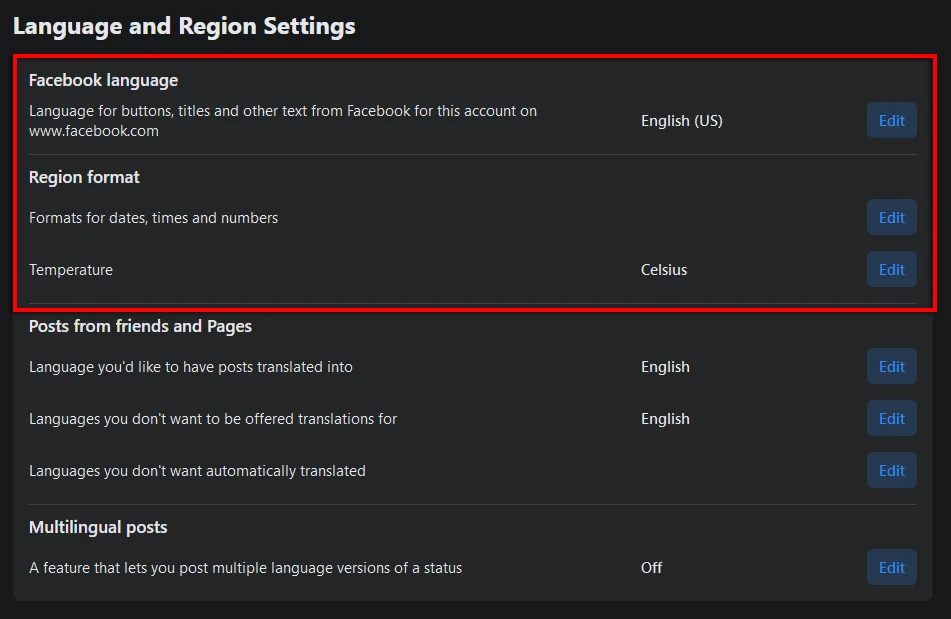 - Thay đổi định dạng và ngôn ngữ khu vực của bạn thành một trong những định dạng và ngôn ngữ được hỗ trợ bằng cách nhấn chỉnh sửasau đó đăng xuất và đăng nhập lại.