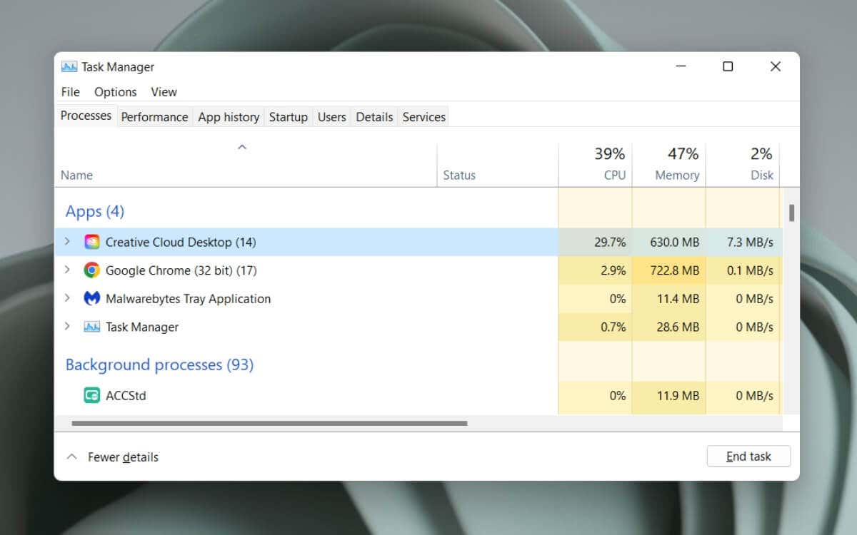 Do Creative Cloud Desktop chạy tự động khi khởi động nên việc Adobe CEF Helper hiển thị trong Trình quản lý tác vụ Windows là điều bình thường. Việc sử dụng CPU cũng thường tăng đột biến khi Creative Cloud Desktop chạy một tác vụ đang hoạt động, chẳng hạn như cài đặt ứng dụng Adobe hoặc đồng bộ hóa tệp với Adobe Creative Cloud. Điều tương tự cũng áp dụng cho các quy trình khác của Adobe—ví dụ: CCXProcess, CCLibrary và AdobeIPCBroker.